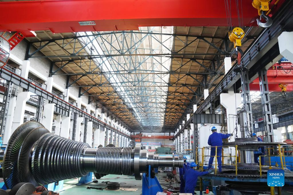 Workers are busy in a workshop of Harbin Turbine Company Ltd. of Harbin Electric Corporation in Harbin, northeast China's Heilongjiang Province, May 7, 2022. The local economy in Heilongjiang continued to recover amid stronger growth momentum in the first quarter. Heilongjiang's value-added industrial output, an important economic indicator, went up 8.1 percent year on year in the first quarter of this year. (Xinhua/Wang Jianwei)