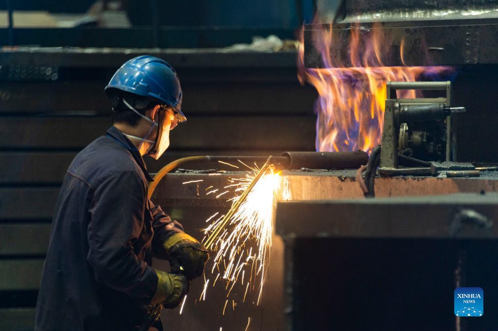 A worker is busy in a workshop of Harbin Turbine Company Ltd. of Harbin Electric Corporation in Harbin, northeast China's Heilongjiang Province, May 7, 2022. The local economy in Heilongjiang continued to recover amid stronger growth momentum in the first quarter. Heilongjiang's value-added industrial output, an important economic indicator, went up 8.1 percent year on year in the first quarter of this year. (Xinhua/Wang Jianwei)