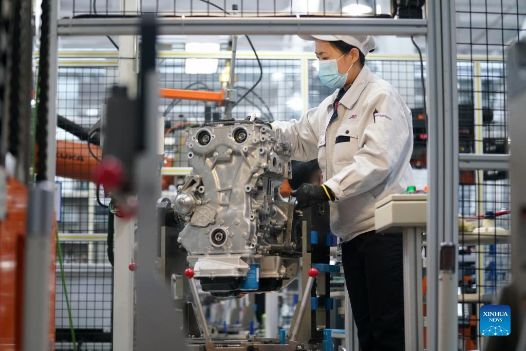 Workers are busy in a workshop of Dongan Auto Engine Co., Ltd. in Harbin, northeast China's Heilongjiang Province, April 15, 2022. The local economy in Heilongjiang continued to recover amid stronger growth momentum in the first quarter. Heilongjiang's value-added industrial output, an important economic indicator, went up 8.1 percent year on year in the first quarter of this year. (Xinhua/Wang Jianwei)