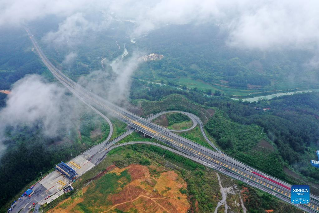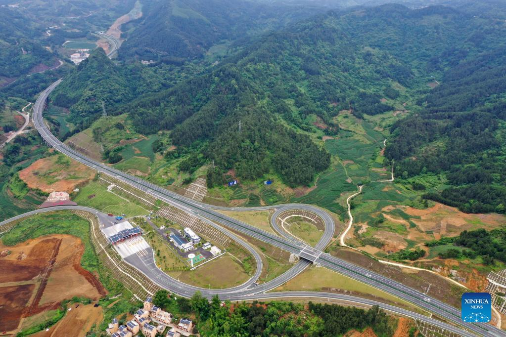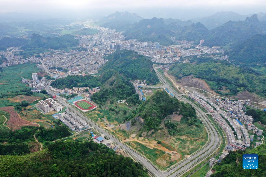Aerial photo taken on May 8, 2022 shows a view of the roads in Bama Yao Autonomous County, south China's Guangxi Zhuang Autonomous Region. In recent years, Bama has improved road network in the county to promote the economic development. (Xinhua/Lu Boan)