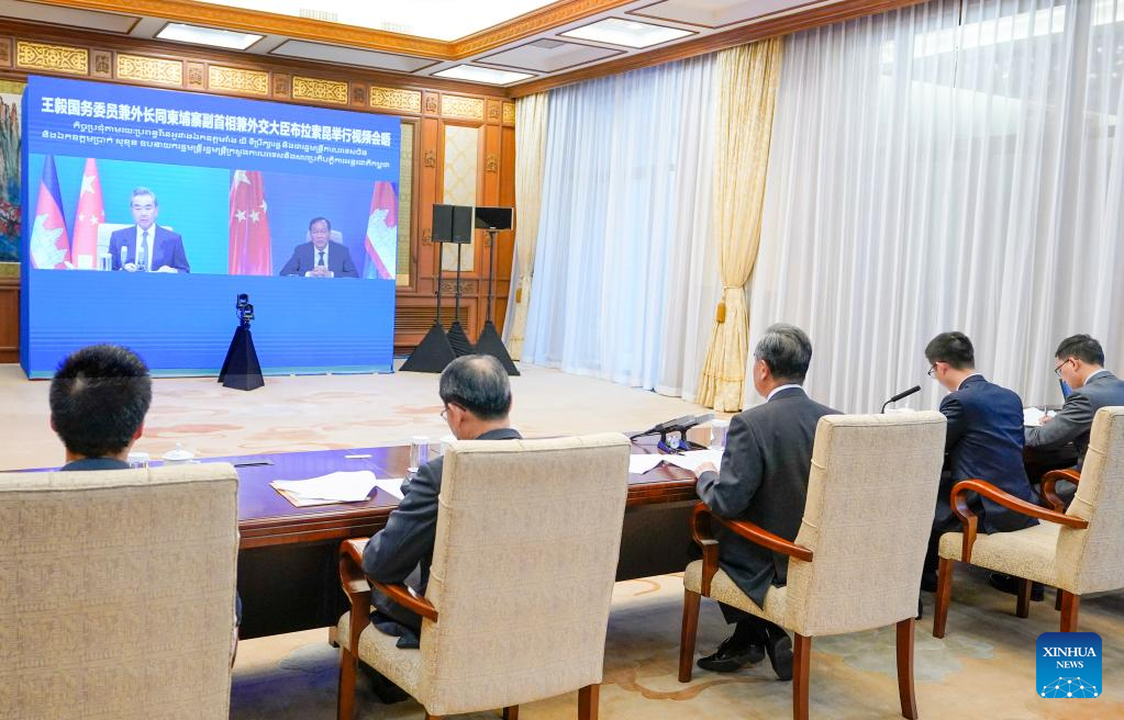 Chinese State Councilor and Foreign Minister Wang Yi meets with Cambodian Deputy Prime Minister and Foreign Minister Prak Sokhonn via video link, May 8, 2022. (Xinhua/Gao Jie)