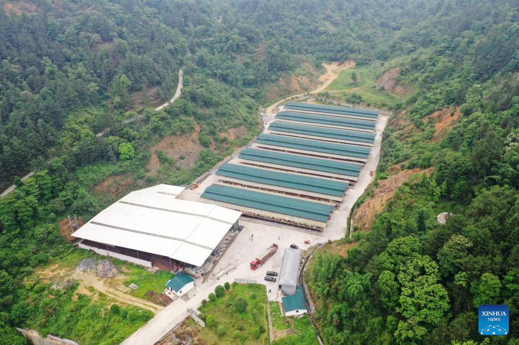 Aerial photo shows a sheep breeding base in Dongli Village, Donglan County of south China's Guangxi Zhuang Autonomous Region, May 6, 2022. Donglan County, Bama Yao Autonomous County and Fengshan County of Hechi City are located in karst mountains in northwestern Guangxi.