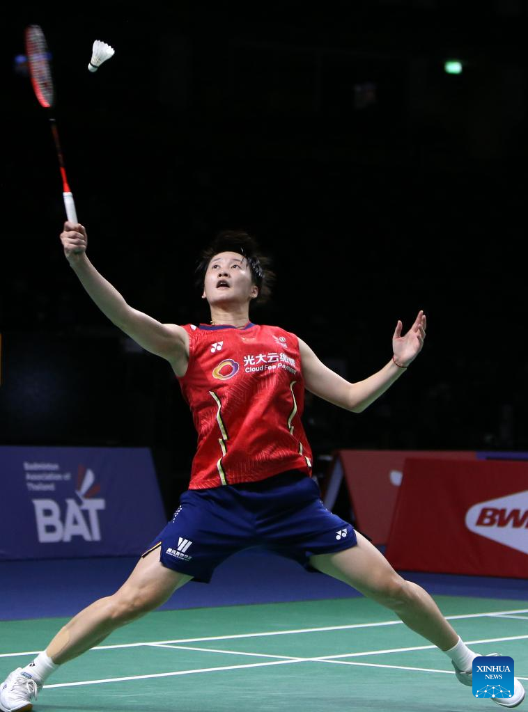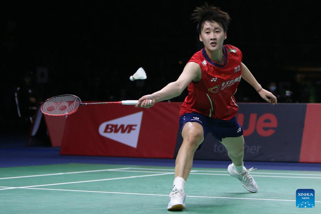 Chen Yufei of China competes against Clara Azurmendi of Spain during the women's singles match of Group B at the Uber Cup badminton tournament in Bangkok, Thailand, May 9, 2022. (Xinhua/Wang Teng)