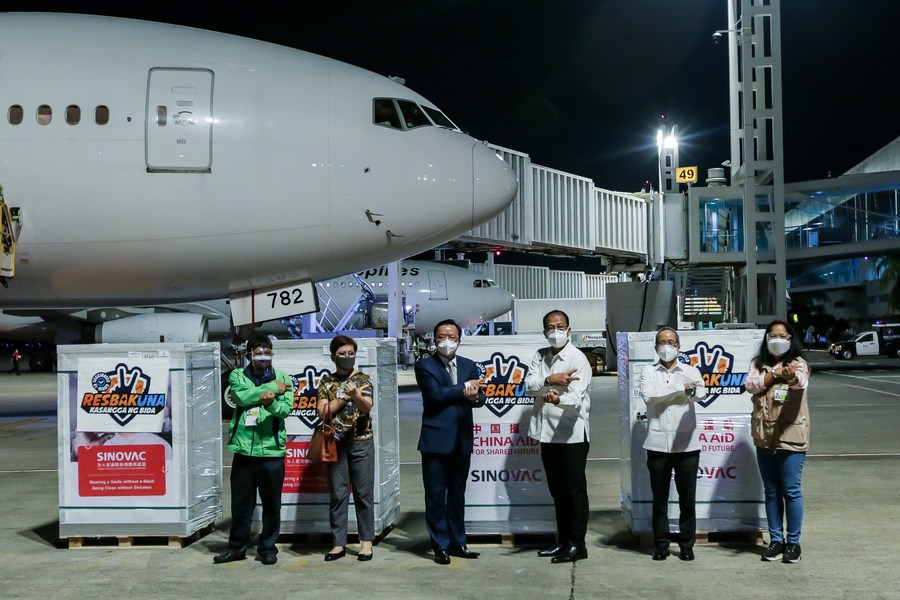 China's Ambassador to the Philippines Huang Xilian (3rd L) and Carlito Galvez (3rd R), the chief implementer of Philippine government's measures to combat COVID-19, are seen with officials from the Philippine government in front of cargos containing Sinovac vaccines in Pasay City, the Philippines, Oct. 24, 2021. (Rouelle Umali/Xinhua)