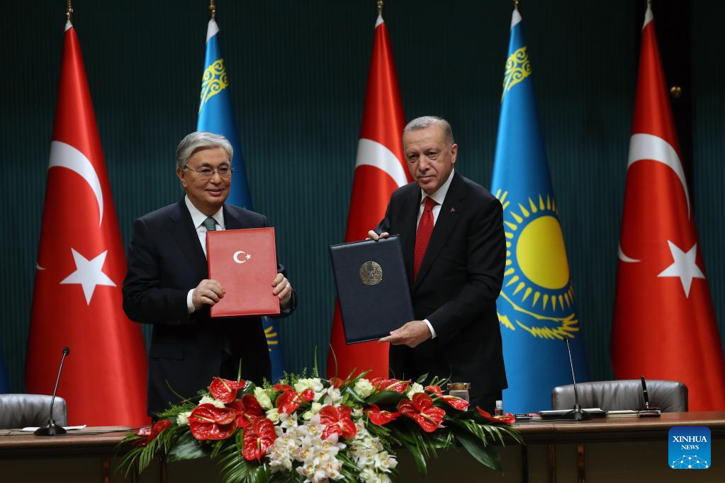 Turkish President Recep Tayyip Erdogan (R) and Kazakh President Kassym-Jomart Tokayev attend a press conference in Ankara, Turkey, on May 10, 2022. Turkey and Kazakhstan aim to reach the target of 10 billion U.S. dollars in bilateral trade, Turkish President Recep Tayyip Erdogan said on Tuesday. (Photo by Mustafa Kaya/Xinhua)
