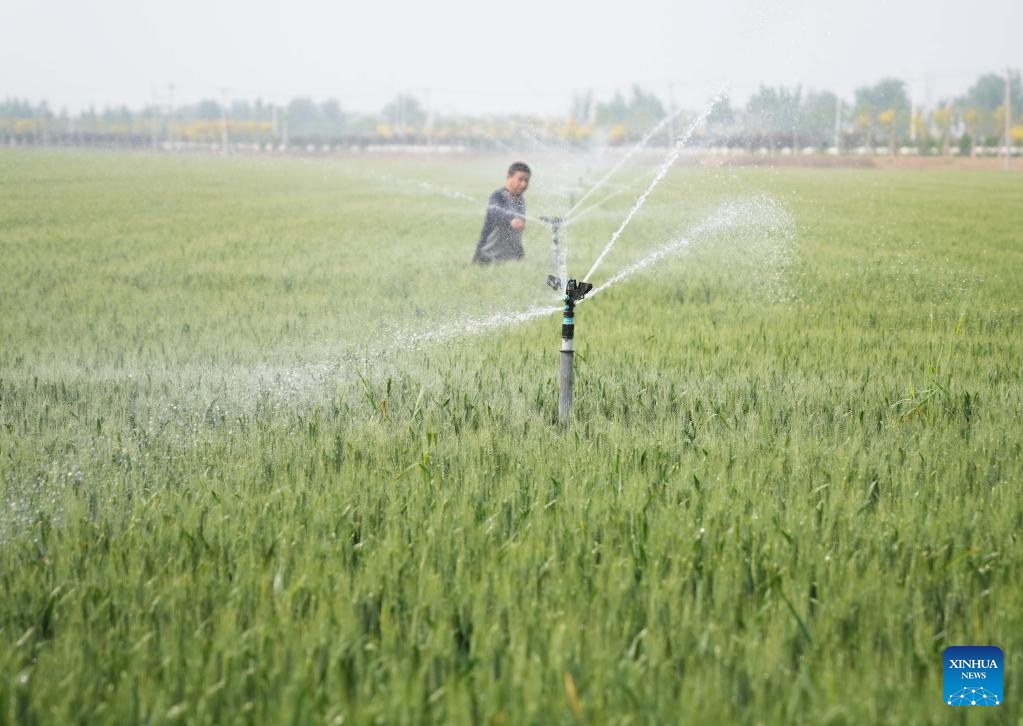 A member of an agriculture cooperative irrigates a field of winter wheat in Shenze County, north China's Hebei Province, May 10, 2022. Hebei has stepped up efforts on farming activities recently. The province's spring sowing area of grain is expected to reach about 1.74 million hectares this year. (Xinhua/Yang Shiyao)
