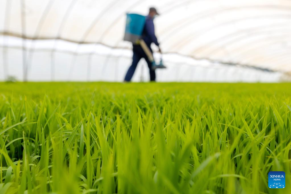 Farmer works at a rice seedling breeding base in Tangshan, north China's Hebei Province, May 9, 2022. Hebei has stepped up efforts on farming activities recently. The province's spring sowing area of grain is expected to reach about 1.74 million hectares this year. (Photo by Li Xiuqing/Xinhua)