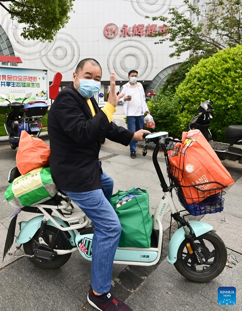 A resident waves after shopping at a supermaket in Songjiang District of east China's Shanghai, May 10, 2022. With the number of new infections continuing to go down, retail stores in Shanghai have been gradually returned to normal operation in some areas of the city. (Xinhua/Li He)