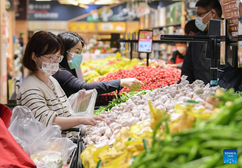 Customers buy vegetables at a supermarket in Songjiang District of east China's Shanghai, May 10, 2022. With the number of new infections continuing to go down, retail stores in Shanghai have been gradually returned to normal operation in some areas of the city. (Xinhua/Li He)
