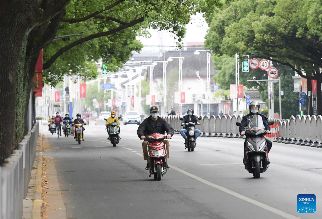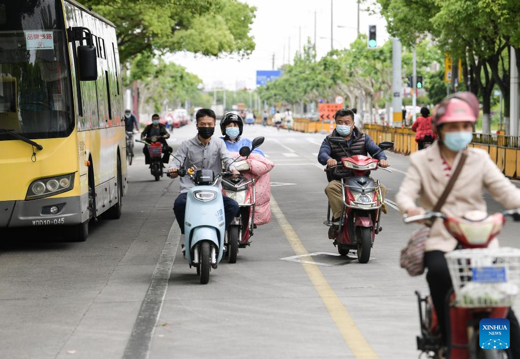 People ride electric bicycles on the street in Songjiang District of east China's Shanghai, May 10, 2022. With the number of new infections continuing to go down, retail stores in Shanghai have been gradually returned to normal operation in some areas of the city. (Xinhua/Li He)
