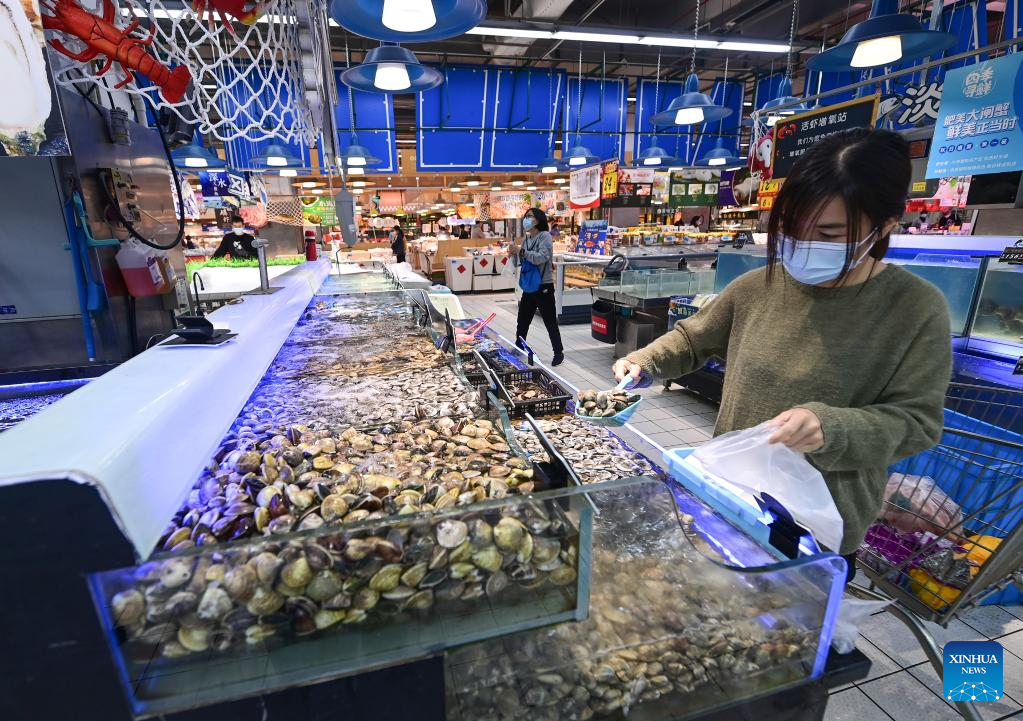 A resident buys seafood at a supermarket in Jiading District of east China's Shanghai, May 9, 2022. With the number of new infections continuing to go down, retail stores in Shanghai have been gradually returned to normal operation in some areas of the city. (Xinhua/Li He)