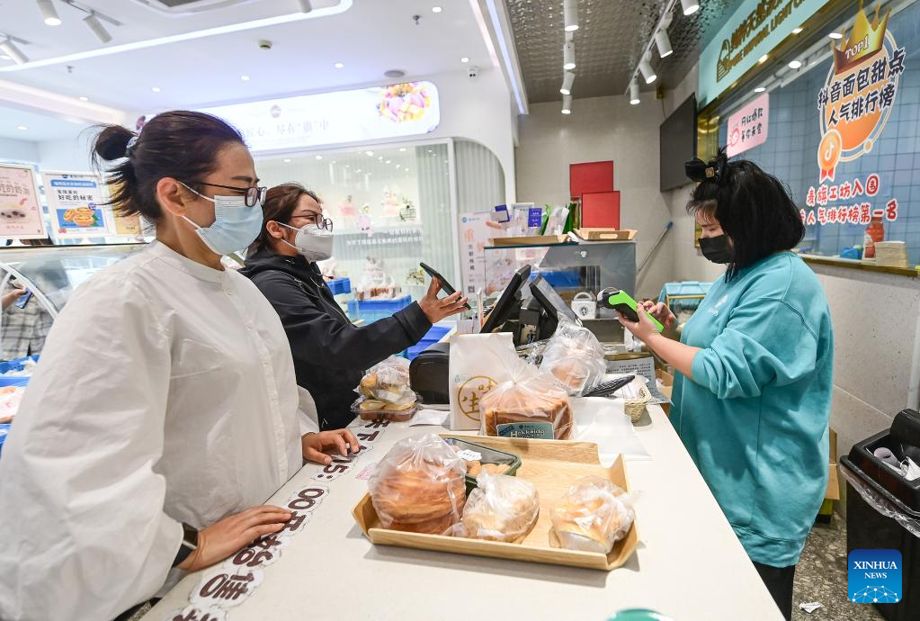 People buy bread at a bakery in Songjiang District of east China's Shanghai, May 10, 2022. With the number of new infections continuing to go down, retail stores in Shanghai have been gradually returned to normal operation in some areas of the city. (Xinhua/Li He)