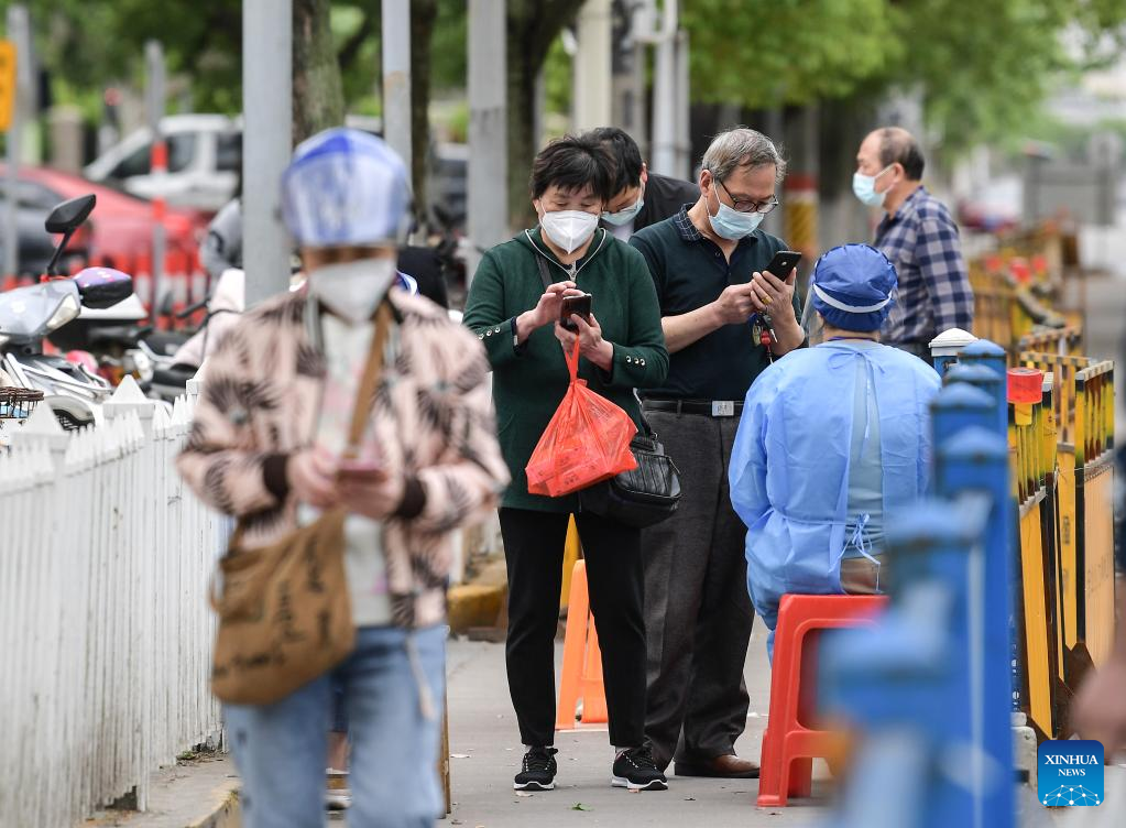 Residents show their nucleic acid test reports before entering a market in Jiading Distirct of east China's Shanghai, May 9, 2022. With the number of new infections continuing to go down, retail stores in Shanghai have been gradually returned to normal operation in some areas of the city. (Xinhua/Li He)