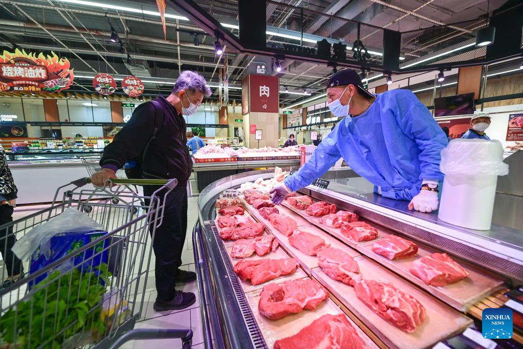 A resident buys meat at a supermarket in Songjiang District of east China's Shanghai, May 10, 2022. With the number of new infections continuing to go down, retail stores in Shanghai have been gradually returned to normal operation in some areas of the city. (Xinhua/Li He)