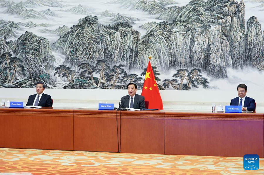 Wang Chen, a member of the Political Bureau of the Communist Party of China Central Committee and vice chairman of the National People's Congress (NPC) Standing Committee, meets with Suchart Tancharoen, first deputy speaker of the House of Representatives of Thailand, via video link in Beijing, capital of China, May 10, 2022. (Xinhua/Zhang Ling)