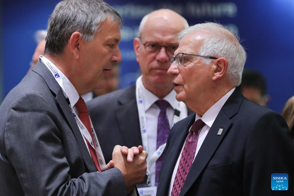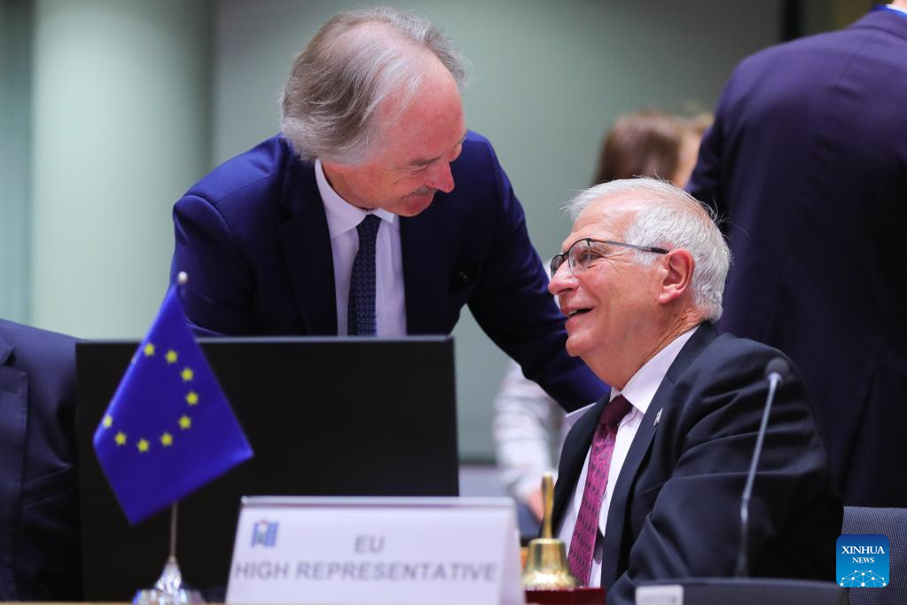 United Nations Special Envoy for Syria Geir O. Pedersen (L) talks with the European Union's High Representative for Foreign Affairs and Security Policy Josep Borrell prior to a meeting of the sixth European Union's Conference on Supporting the Future of Syria and the Region in Brussels, Belgium, May 10, 2022. (Xinhua/Zheng Huansong)