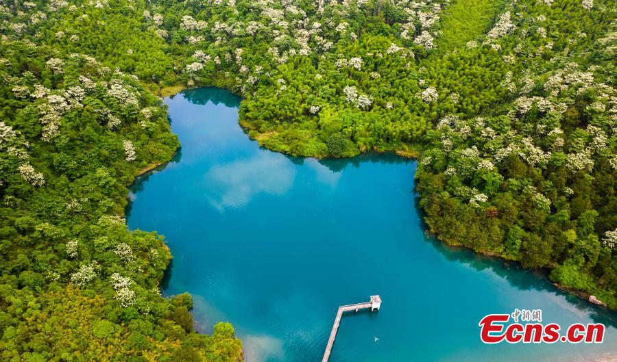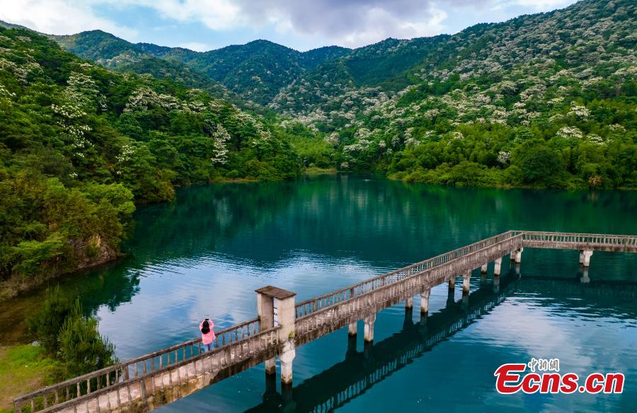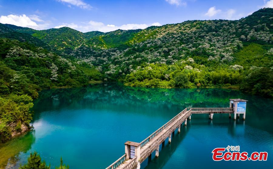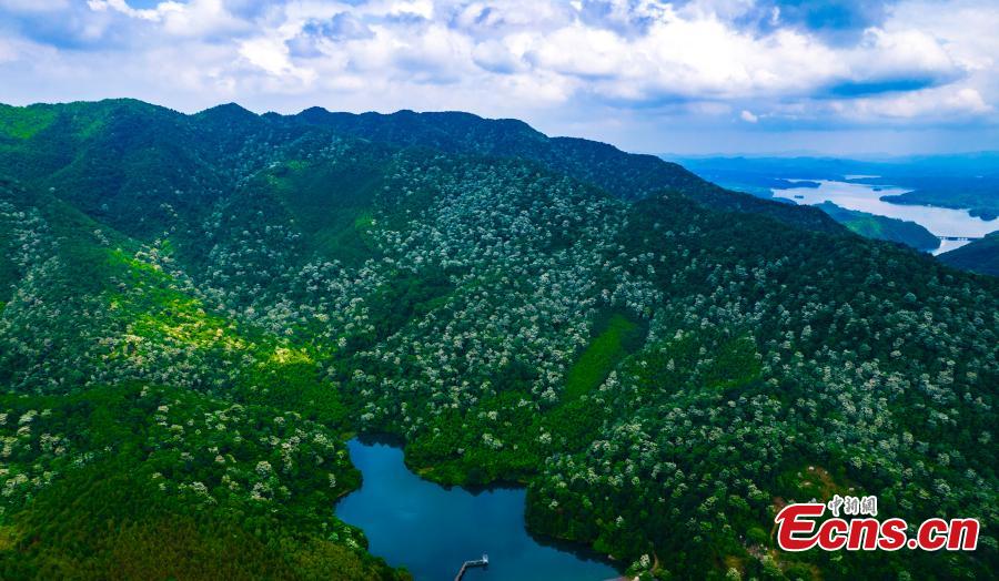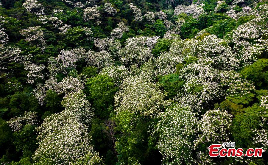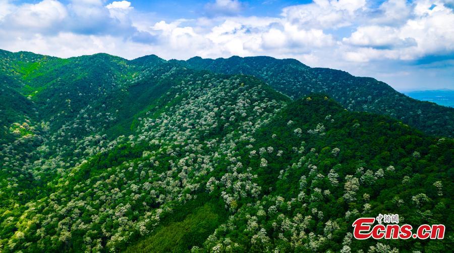 White flowers of wild princess trees are in full blossom on mountains in Xinyu, east China's Jiangxi Province, May 9, 2022, forming a unique scenery in Summer. (Photo: China News Service/Zhao Chunliang)