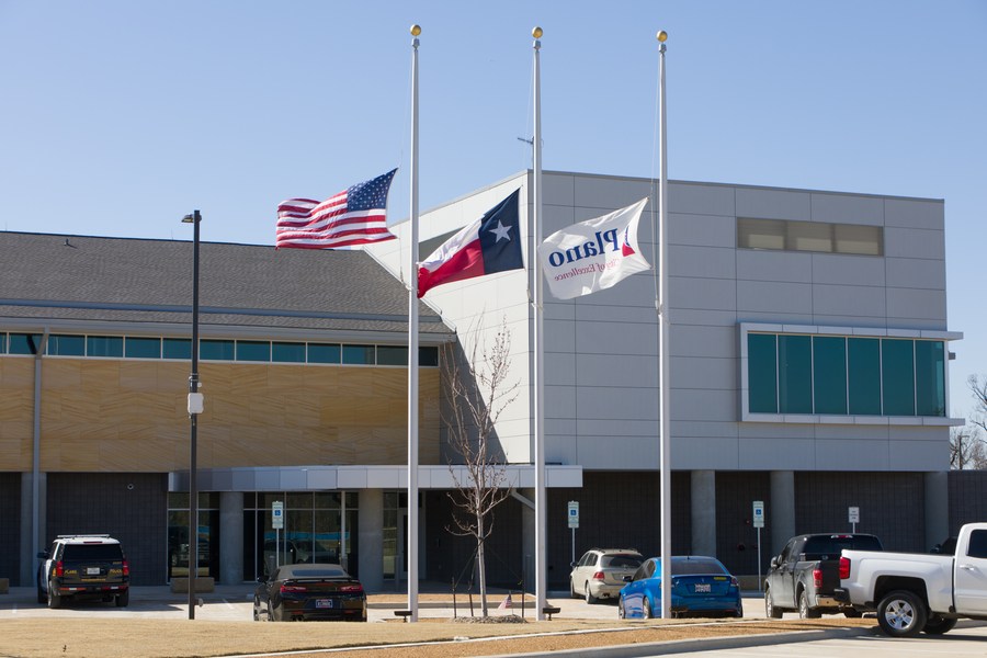 Photo taken on Feb. 24, 2021 shows the U.S. flag, Texas flag, and Plano city flag lowered to half-staff in front of Plano Police Station in Plano, northern suburban city of Dallas, Texas, the United States. The United States reached the grim milestone of half a million coronavirus deaths on Feb. 22, 2021, according to the Center for Systems Science and Engineering at Johns Hopkins University. (Photo by Dan Tian/Xinhua)