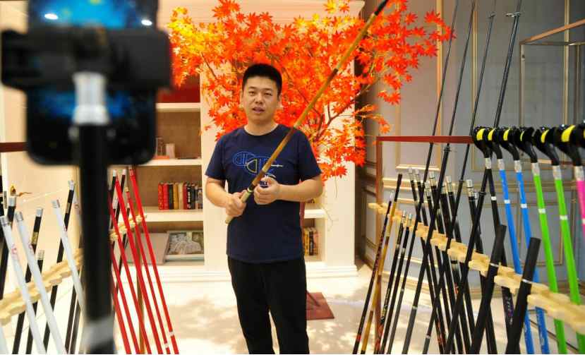 A host promotes fishing rods via livestreaming platform at an e-commerce supplies base in Suning county, north China’s Hebei province, June 6, 2020. (People’s Daily Online/Yuan Liwei)