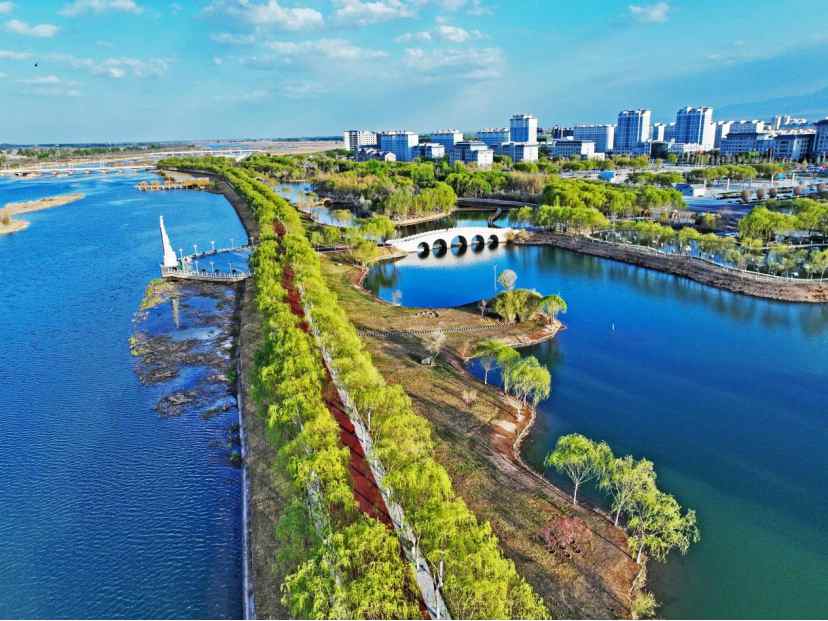 Photo taken on April 17, 2022 shows picturesque spring scenery of a wetland park along Heihe River in Gaotai county, Zhangye city, northwest China’s Gansu province. (People’s Daily Online/Zheng Yaode)