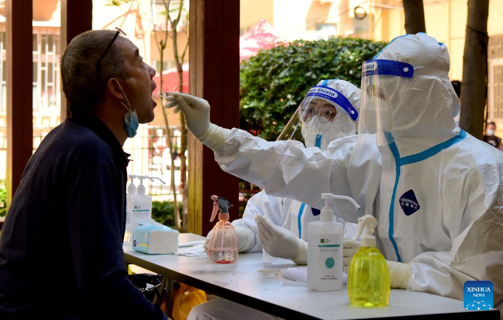 A medical worker takes a swab sample from a citizen for nucleic acid test at a residential area in Zhengzhou, central China's Henan Province, May 4, 2022. Zhengzhou has resumed work and production from May 11 in the city other than closed-off management areas and restrictive control areas. (Xinhua/Li Jianan)