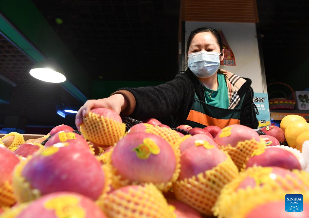 A vendor arranges apples at a market in Zhengzhou, central China's Henan Province, May 10, 2022. Zhengzhou has resumed work and production from May 11 in the city other than closed-off management areas and restrictive control areas. (Xinhua/Li Jianan)
