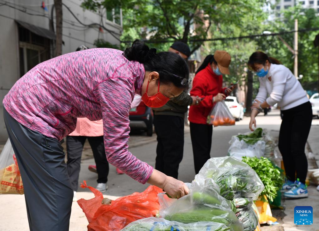 Citizens purchase vegetables at a residential area in Zhengzhou, central China's Henan Province, May 10, 2022. Zhengzhou has resumed work and production from May 11 in the city other than closed-off management areas and restrictive control areas. (Xinhua/Li Jianan)