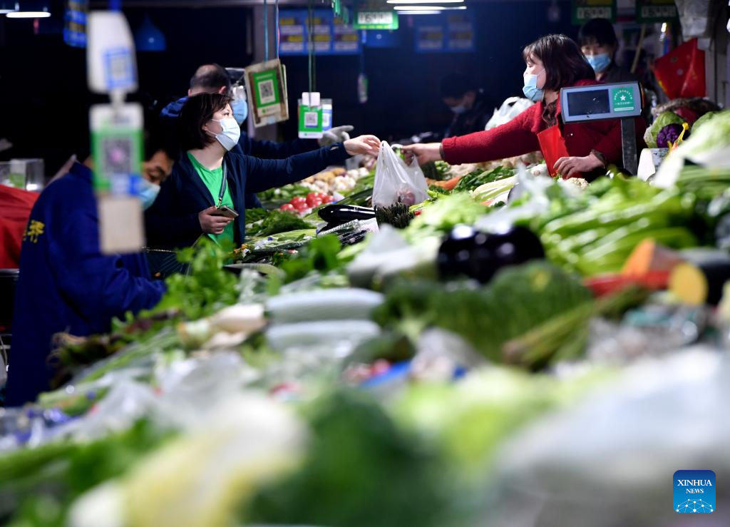 Citizens purchase vegetables at a market in Zhengzhou, central China's Henan Province, May 10, 2022. Zhengzhou has resumed work and production from May 11 in the city other than closed-off management areas and restrictive control areas. (Xinhua/Li Jianan)