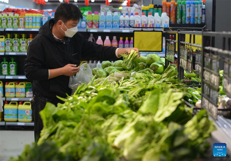 A customer buys vegetables at a supermarket in Linquan County, east China's Anhui Province, May 11, 2022. China's consumer price index (CPI), a main gauge of inflation, rose 2.1 percent year on year in April, the National Bureau of Statistics (NBS) said Wednesday. (Photo by Lu Qijian/Xinhua)