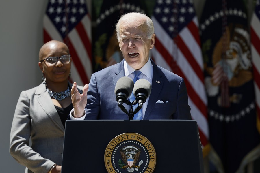 U.S. President Joe Biden (R) speaks during an event, at the White House in Washington, D.C., the United States, on May 9, 2022. Biden said that the administration is "discussing" whether to drop hiked tariffs on Chinese products. (Photo by Ting Shen/Xinhua)