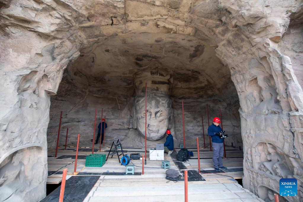 Technicians collect information of relics in Cave 17 of the Yungang Grottoes in Datong, north China's Shanxi Province, May 11, 2022.