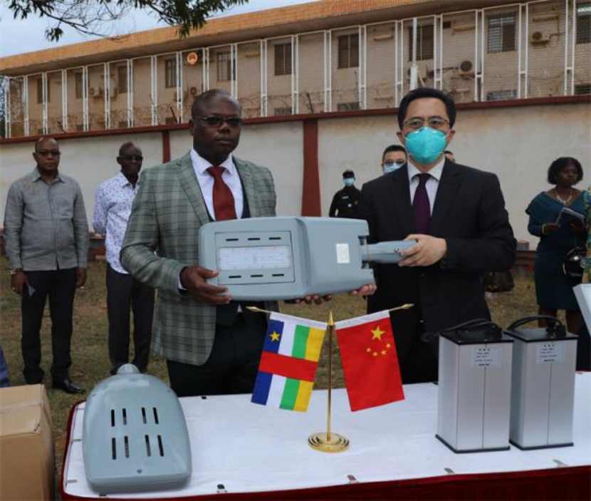 Shan Chenglin, Chargé d'Affaires of the Chinese Embassy in Central African Republic hands over a batch of materials at the launching ceremony of a China-aided maintenance program for solar-powered street lamps in the African country held in Bangui, capital of Central African Republic, April 8, 2022. (Photo courtesy of the Chinese Embassy in Central African Republic)