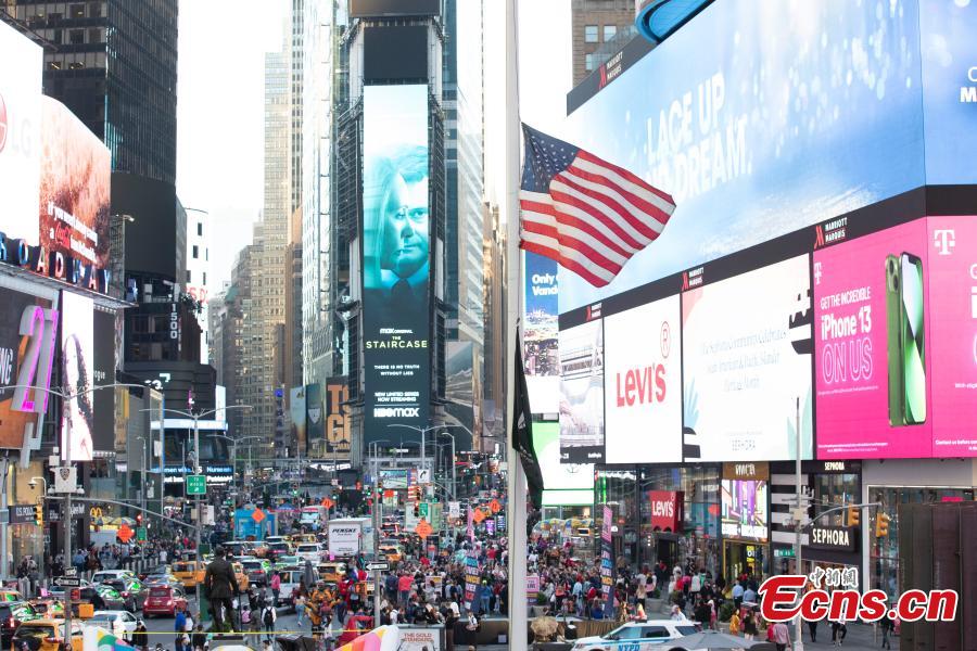 U.S. national flag flies at half-staff at the Times Square to mourn 1 million American lives lost to COVID-19, New York, U.S. May 12, 2022. (Photo: China News Service/Liao Pan)