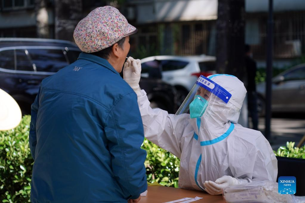 A medic takes a swab sample from a resident for nucleic acid test at a community in Haidian District of Beijing, capital of China, May 13, 2022. Beijing has started three additional rounds of mass nucleic acid testing in 12 districts from Friday to Sunday, as the Chinese capital races against time to contain the latest resurgence of COVID-19 infections. (Xinhua/Ren Chao)