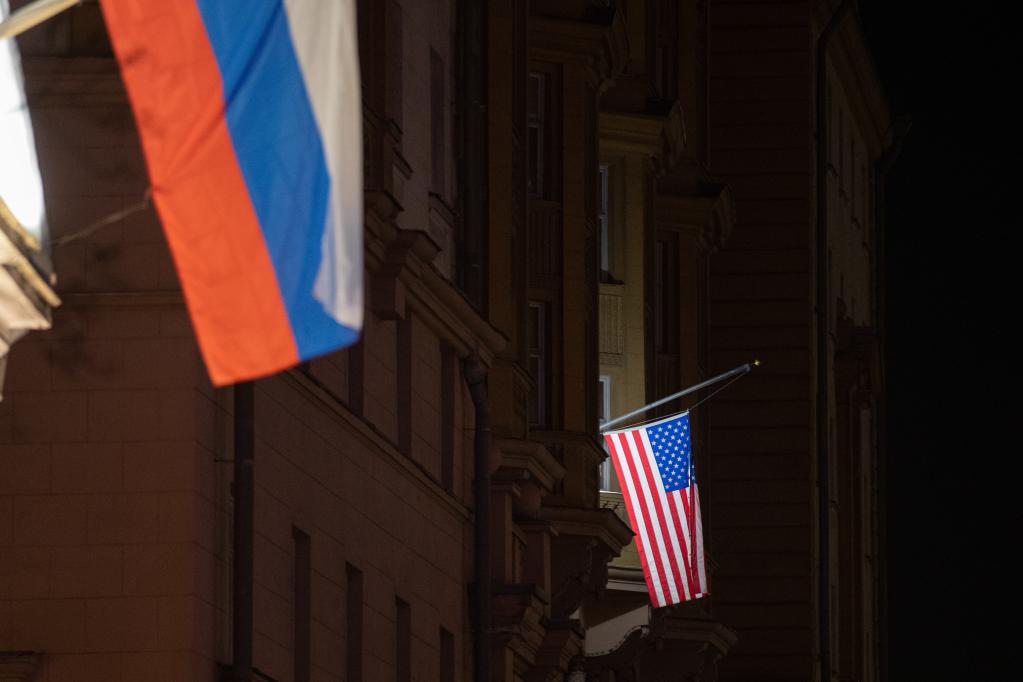 Photo taken on March 24, 2022 shows the U.S. national flag (R) on the U.S. Embassy building in Moscow, Russia. (Xinhua/Bai Xueqi)