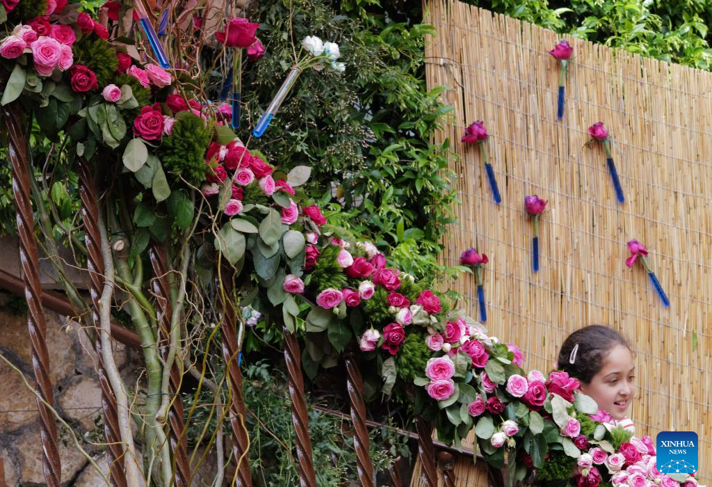 Roses and pink umbrellas are seen during the 50th ExpoRose in Grasse, southern France, on May 13, 2022. The city center of Grasse was turned into rose gardens during the three-day ExpoRose festival which kicked off here on Friday. (Photo by Serge Haouzi/Xinhua)
