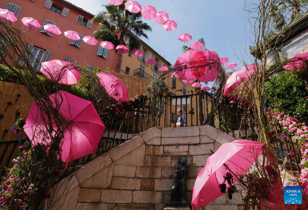 A street is decorated with pink umbrellas during the 50th ExpoRose in Grasse, southern France, on May 13, 2022. The city center of Grasse was turned into rose gardens during the three-day ExpoRose festival which kicked off here on Friday. (Photo by Serge Haouzi/Xinhua)