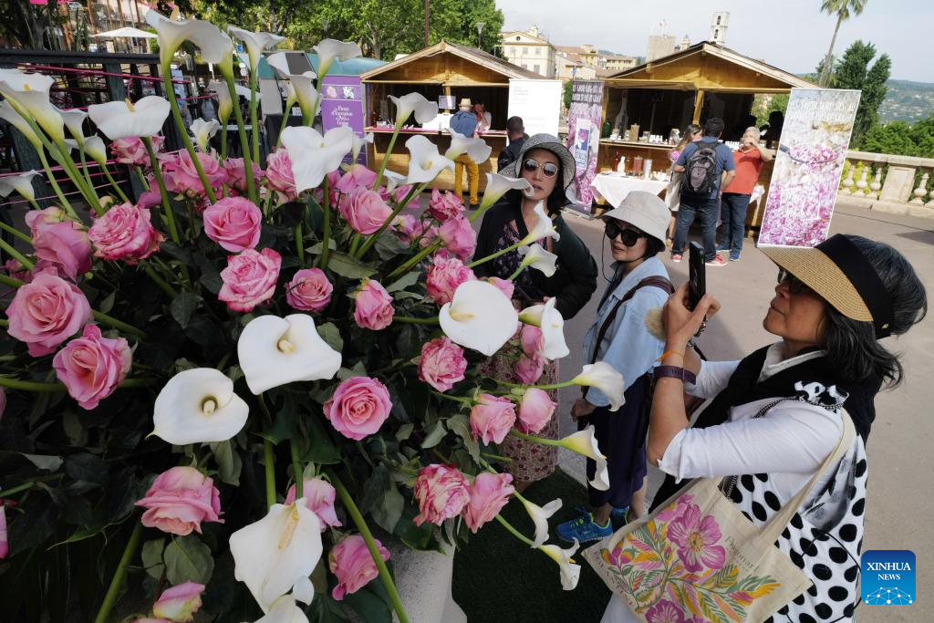 Visitors look at flowers during the 50th ExpoRose in Grasse, southern France, on May 13, 2022. The city center of Grasse was turned into rose gardens during the three-day ExpoRose festival which kicked off here on Friday. (Photo by Serge Haouzi/Xinhua)