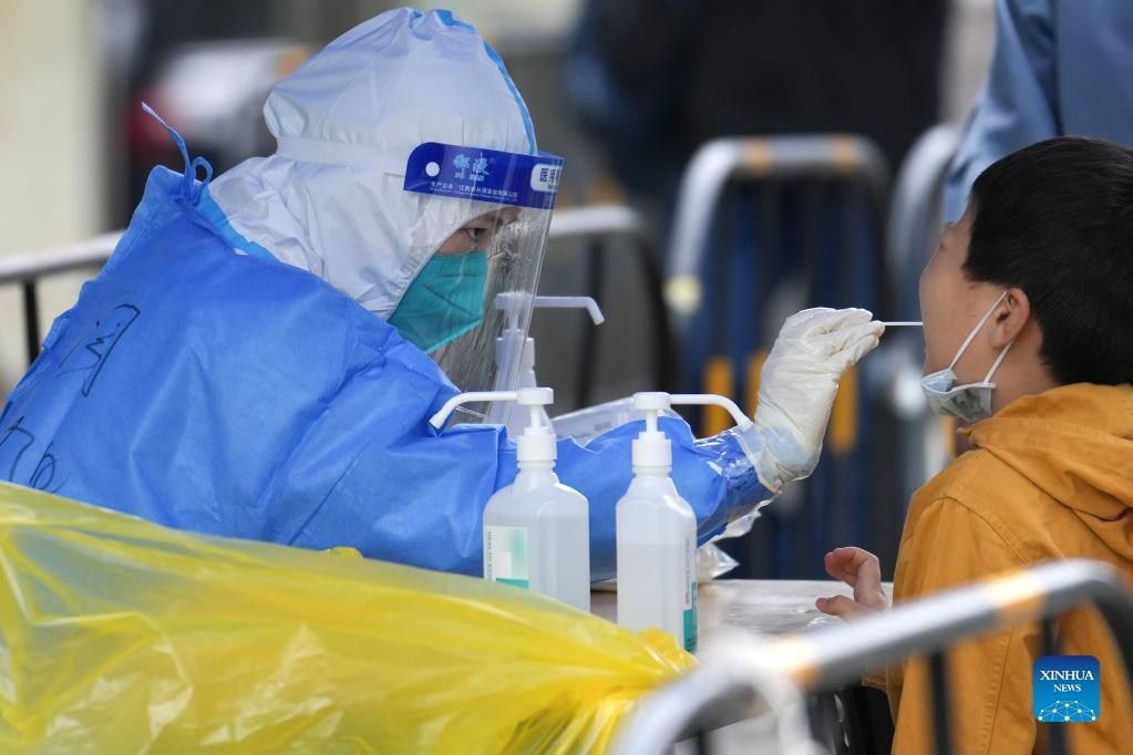Medical worker Yan Xu collects swab samples for nucleic acid testing in Chaoyang District of Beijing, capital of China, May 8, 2022. Chaoyang District started further district-wide nucleic acid testing from May 7 to 9 on. (Xinhua/Ju Huanzong)