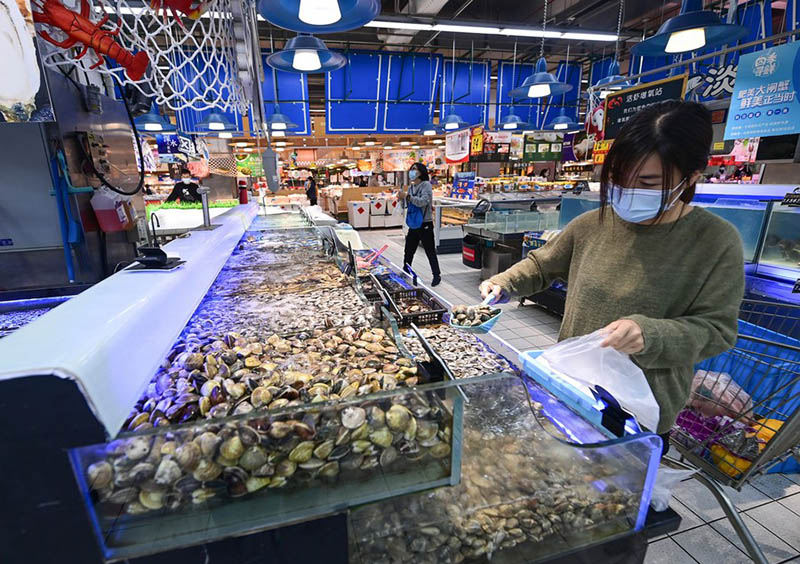 A resident buys seafood at a supermarket in Jiading District of east China's Shanghai, May 9, 2022. (Xinhua/Li He)