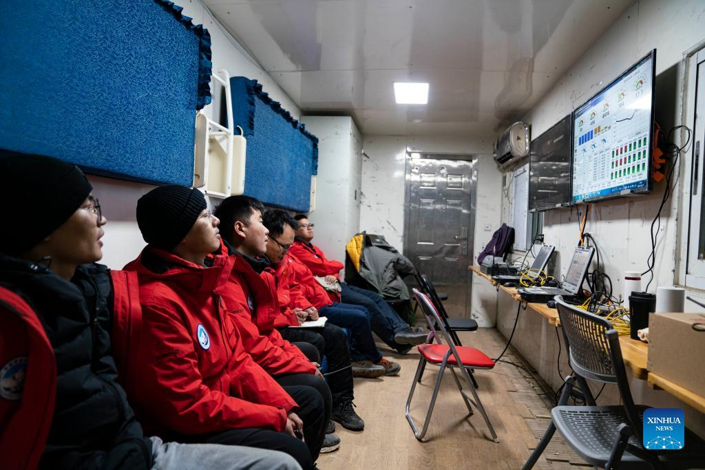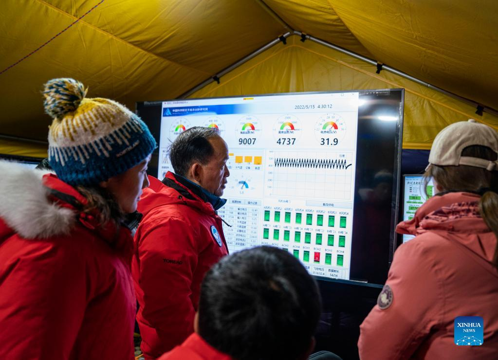 Scientific research members monitor the real-time statistics during the ascent of floating airship "Jimu No.1" type III in Zhaxizom Township of Tingri County, southwest China's Tibet Autonomous Region, May 15, 2022. China's self-developed floating airship, designed for atmosphere observation, reached a record altitude of 9,032 meters in Tibet Autonomous Region on Sunday, according to its developer. Developed by the Aerospace Information Research Institute of the Chinese Academy of Sciences (CAS), the floating airship "Jimu No.1" type III has a volume of 9,060 cubic meters. (Xinhua/Sun Fei)