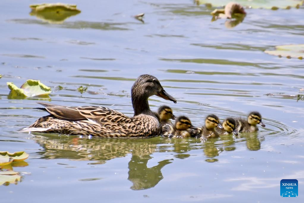 Wild ducks swim in the lake in Yuanmingyuan Park in Beijing, capital of China, May 15, 2022. (Xinhua/Li Xin)