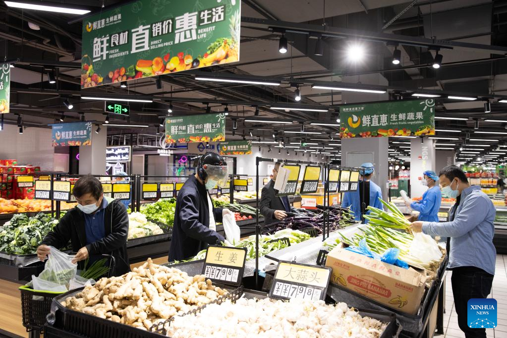 People shop at a supermarket in Xuhui District of east China's Shanghai, May 16, 2022. (Xinhua/Jin Liwang)