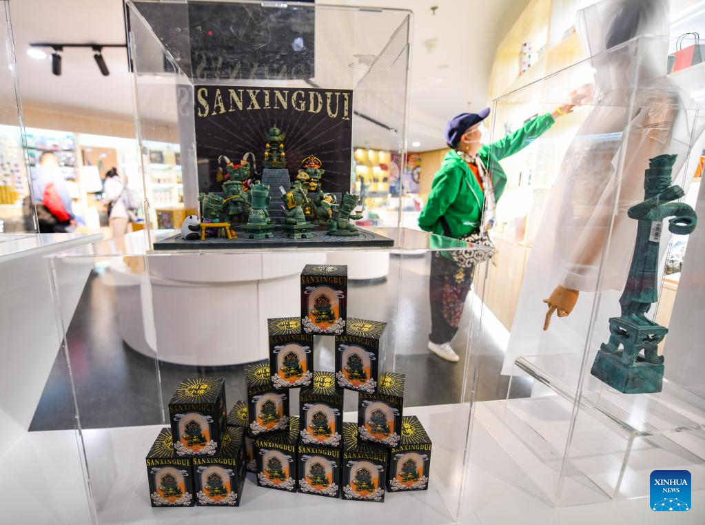 Visitors shop at a souvenir store in the Sanxingdui Museum in Guanghan, southwest China's Sichuan Province, May 16, 2022. In recent years, important archaeological discoveries from Sanxingdui Ruins site have driven the boom of the designing and sales of cultural and creative products in the Sanxingdui Museum.