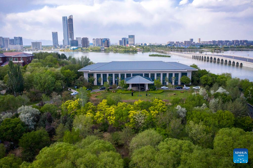 Aerial photo taken on May 15, 2022 shows the branch venue of the ProWein 2022 in Yinchuan, northwest China's Ningxia Hui Autonomous Region. (Xinhua/Yang Zhisen)