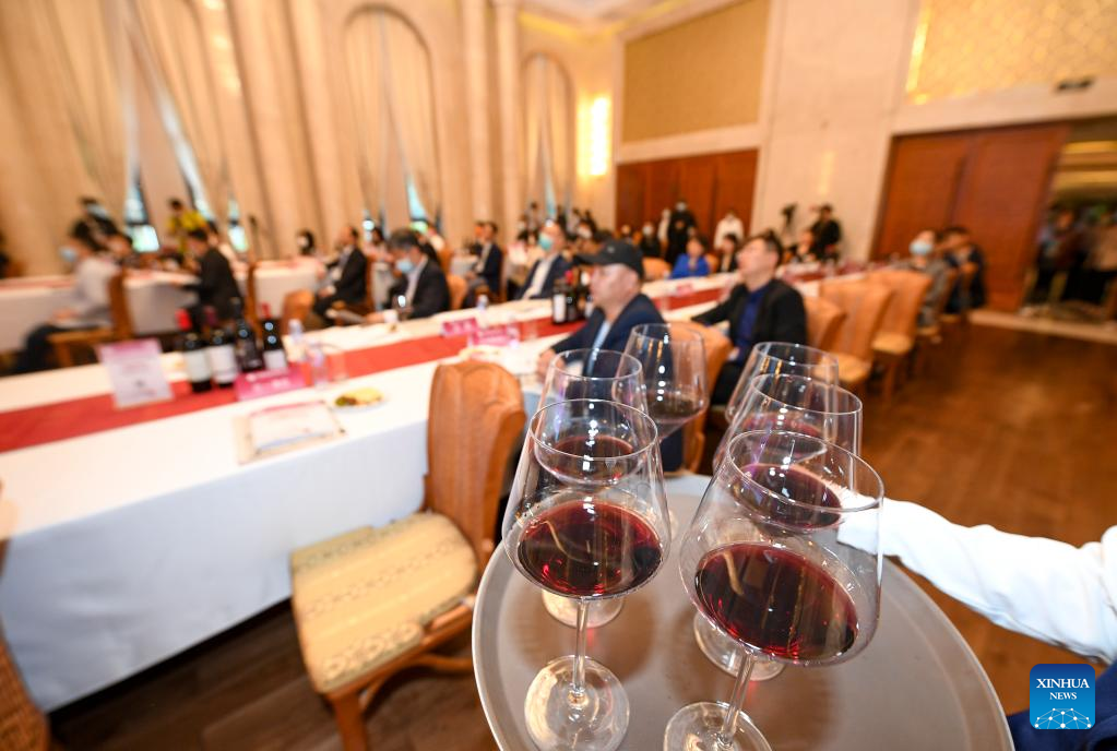 Various wines are served for samplings at a branch venue of the ProWein 2022 in Yinchuan, northwest China's Ningxia Hui Autonomous Region, May 15, 2022. (Xinhua/Feng Kaihua)
