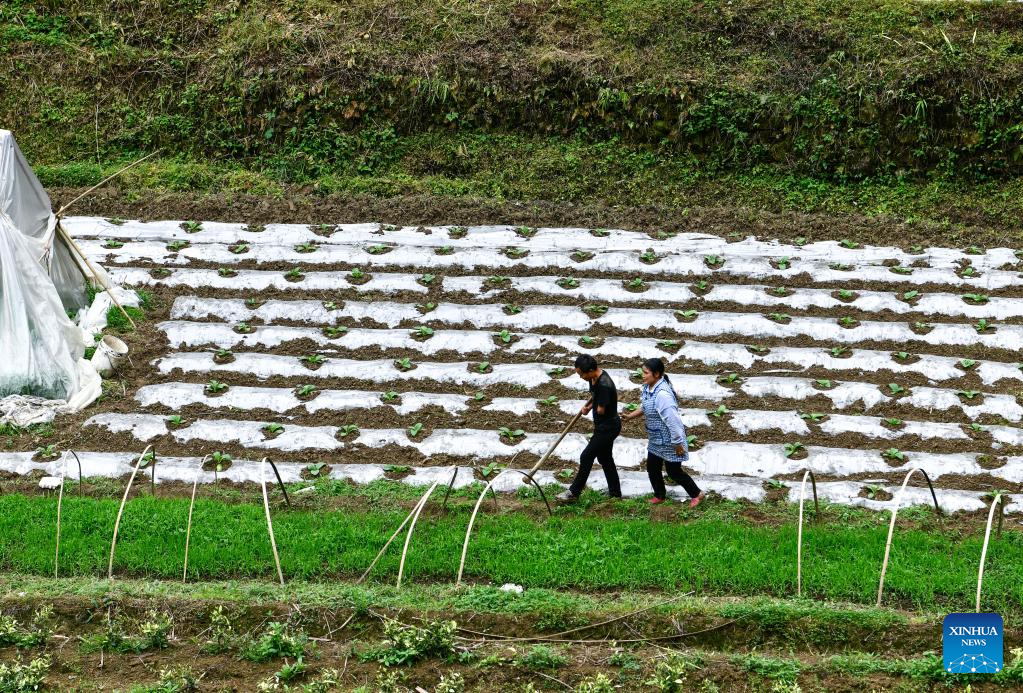 Zhao Youliang and Jian Qin walk to work in the field in Zhongguan Township, Zheng'an County, southwest China's Guizhou Province, May 12, 2022.