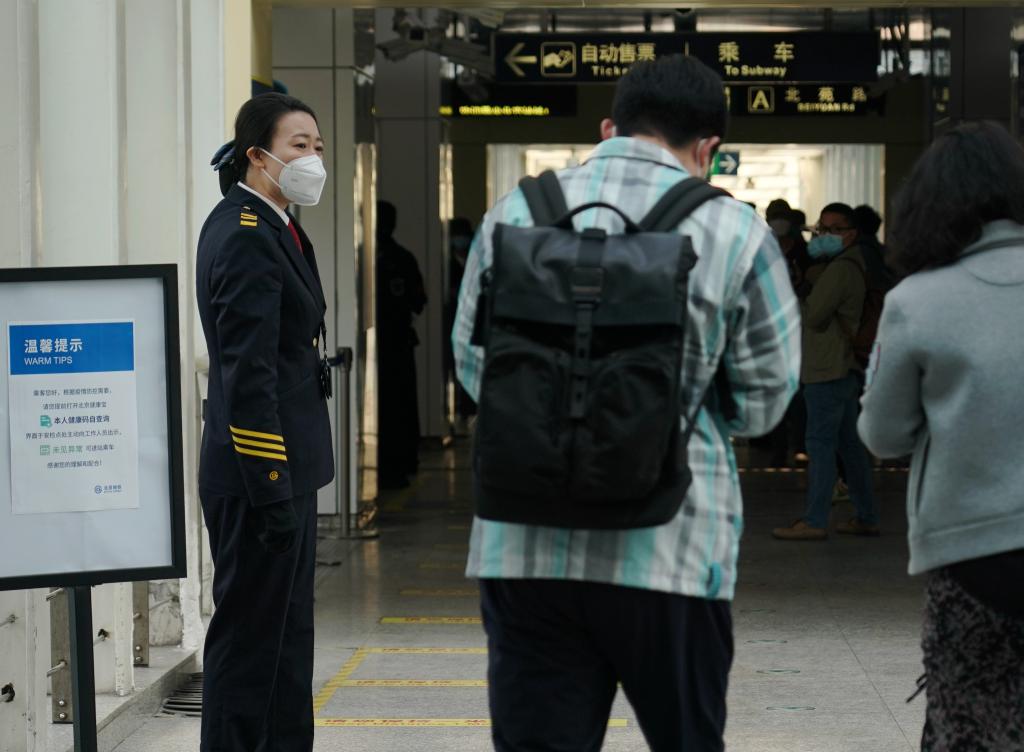 A staff member reminds passengers of showing health QR code at a subway station in Beijing, capital of China, May 17, 2022.