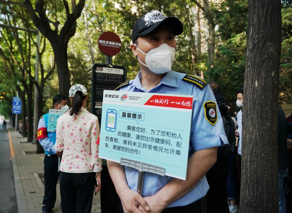 Passengers are required from Tuesday to have their health QR codes checked before taking public transport at some bus stops and subway stations near restrictive control areas and closed-off management areas in Beijing. (Xinhua/Zhang Chenlin)