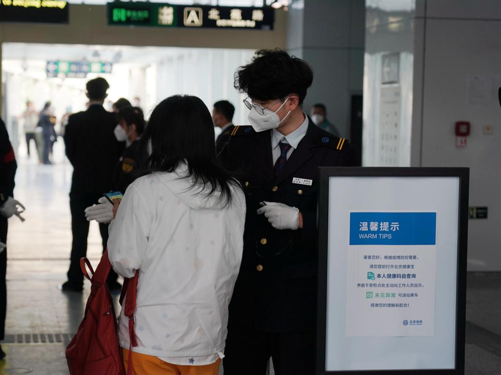 A staff member checks the health QR code of a passenger at a subway station in Beijing, capital of China, May 17, 2022.